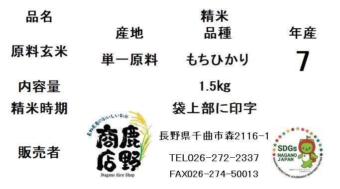 令和7年産 長野県産もちひかり白米 1.5キロ精米したてをお届け!!
